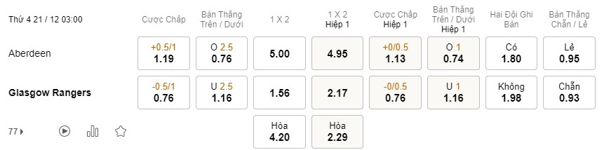 Soi kèo châu Á Aberdeen vs Rangers: 1.19*0.5/1*0.76