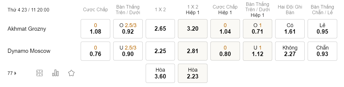 Soi kèo hiệp 1 Akhmat Grozny vs Dinamo Moscow