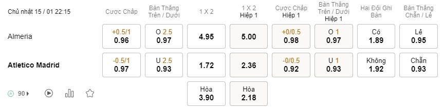 Soi kèo Châu Á Almeria vs Atletico Madrid: 0.96*0.5/1*0.97
