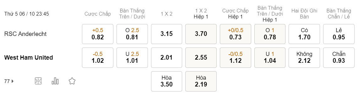 Tỉ lệ kèo Anderlecht vs West Ham