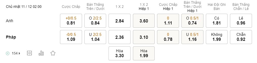 Soi kèo hiệp 1 Anh vs Pháp: 1.11*0*0.78