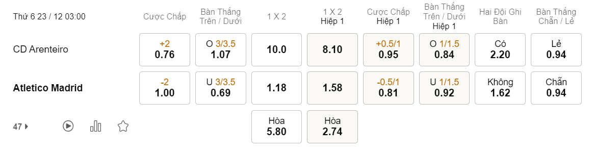 Tỉ lệ kèo Arenteiro vs Atletico Madrid