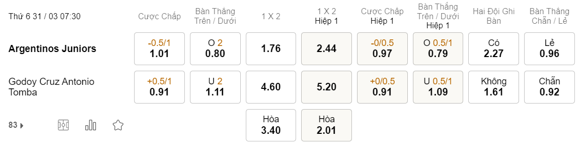 Soi kèo châu Á Argentinos Juniors vs Godoy Cruz: 1.01*0.5/1*0.91