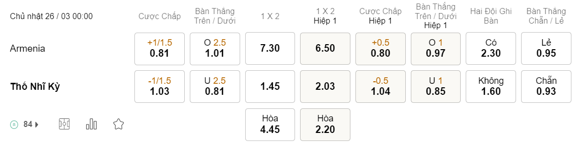 Soi kèo hiệp 1 Armenia vs Thổ Nhĩ Kỳ: 0.80*0.5*1.04