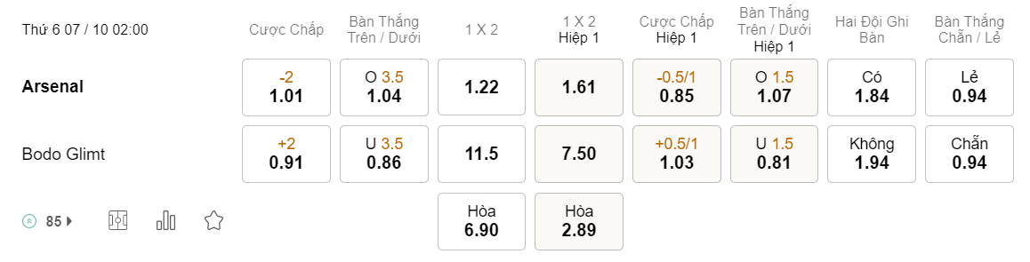 Soi kèo hiệp 1 Arsenal vs Bodo Glimt: 0.85*0.5/1*1.03