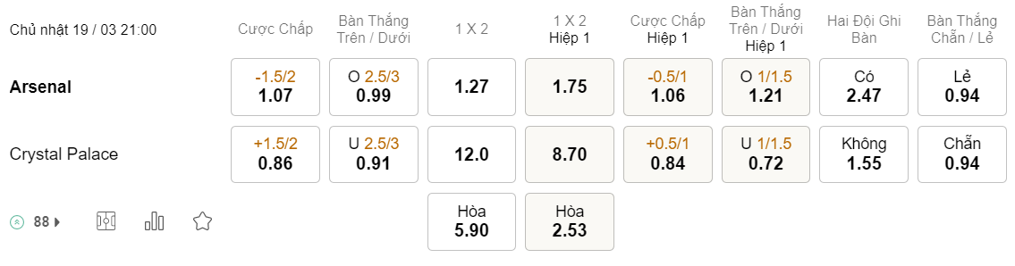 Tỉ lệ kèo Arsenal vs Crystal Palace