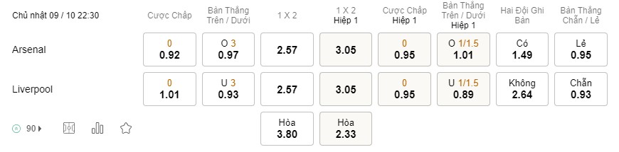 Tỉ lệ kèo Arsenal vs Liverpool