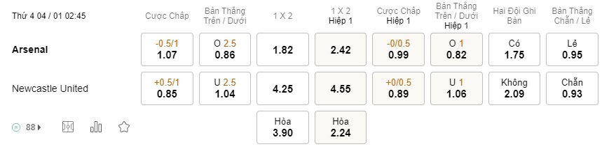 Tỉ lệ kèo Arsenal vs Newcastle