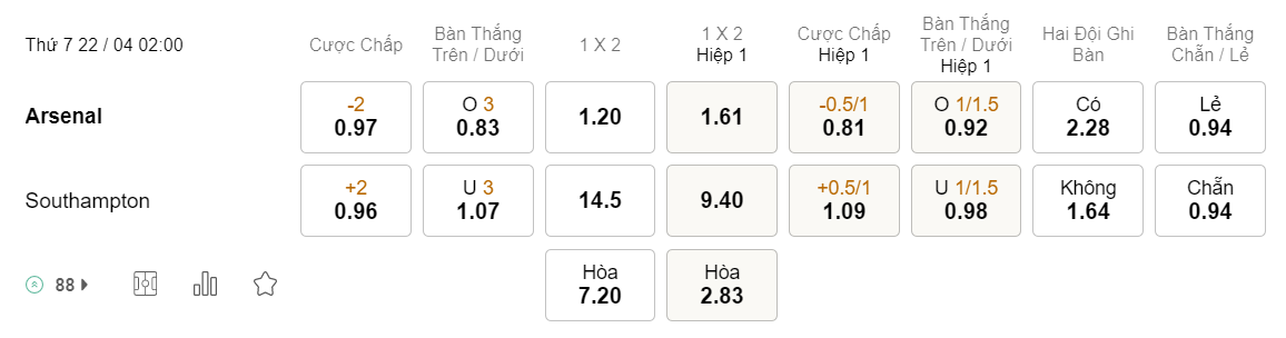 Về phía Southampton, đội bóng này vẫn đang xếp cuối trên BXH EPL và cũng vừa trải qua chuỗi 5 trận liên tiếp không biết tới mùi chiến thắng. Vì vậy, theo các chuyên gia nhận định, lựa chọn Arsenal gần như là điều không phải lăn tăn trong kèo đấu này.