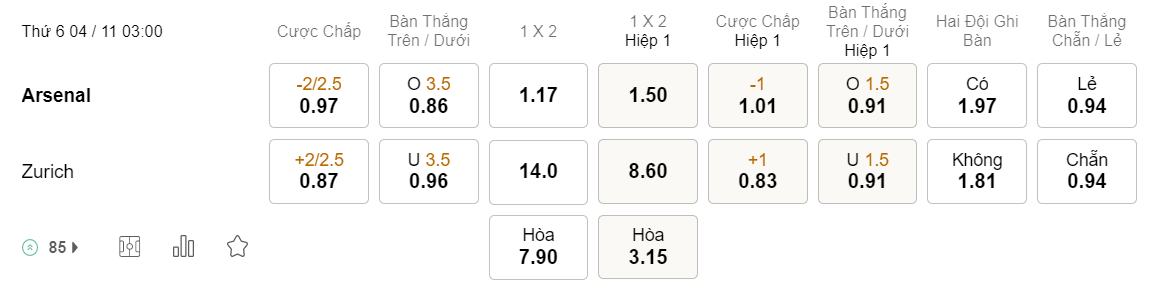 Soi kèo hiệp 1 Arsenal vs Zurich: 1.01*1*0.83
