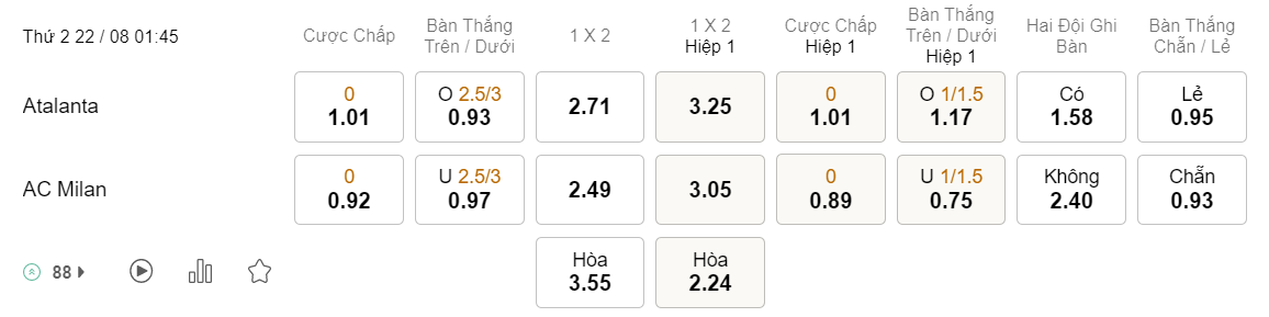 Tỉ lệ kèo Atalanta vs Milan