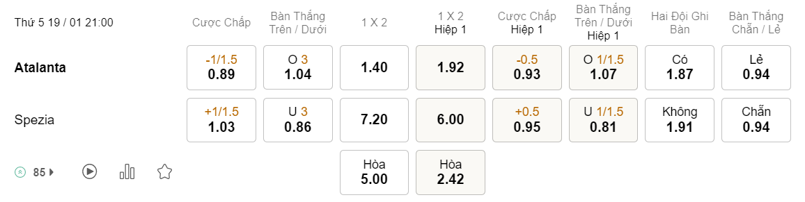 Soi kèo châu Á Atalanta vs Spezia: 0.89*1/1.5*1.03