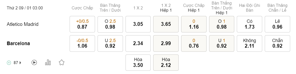Soi kèo hiệp 1 Atletico Madrid vs Barcelona: 1.16*0*0.76