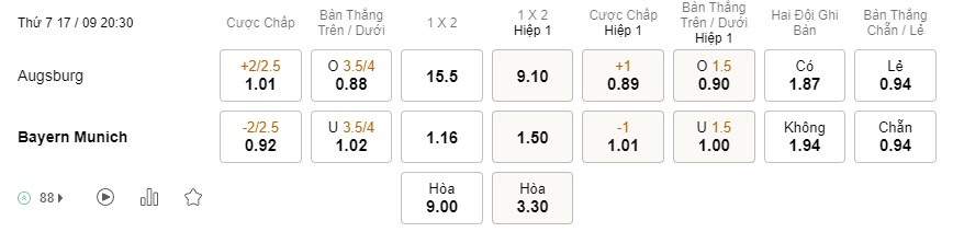 Soi kèo hiệp 1 Augsburg vs Bayern Munich: 0.89*1*1.01