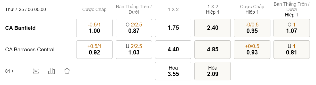 Soi kèo châu Á Banfield vs Barracas Central: 1.00*0.5/1*0.92