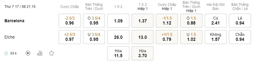 Soi kèo hiệp 1 Barcelona vs Elche: 1.12*1/1.5*0.79