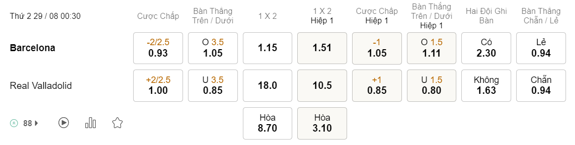 Tỉ lệ kèo Barcelona vs Valladolid