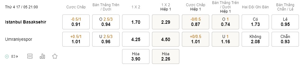 Soi kèo Châu Á Basaksehir vs Umraniyespor: 0.91*0.5/1*1.01