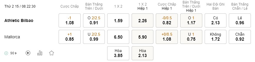 Soi kèo châu Á Bilbao vs Mallorca: 1.08*1*0.85