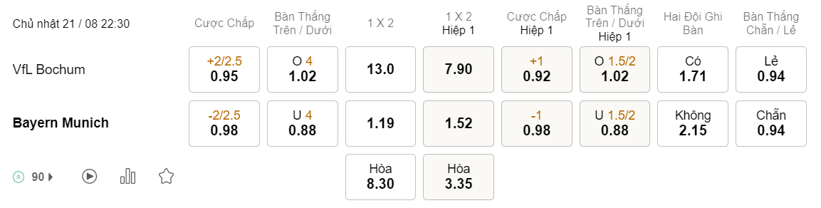 Soi kèo hiệp 1 Bochum vs Bayern: 0.92*1*0.98