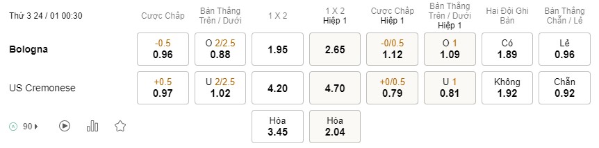 Tỉ lệ kèo Bologna vs Cremonese