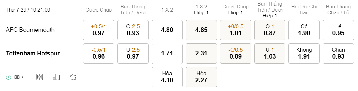 Soi kèo hiệp 1 Bournemouth vs Tottenham: 1.01*0/0.5*0.89