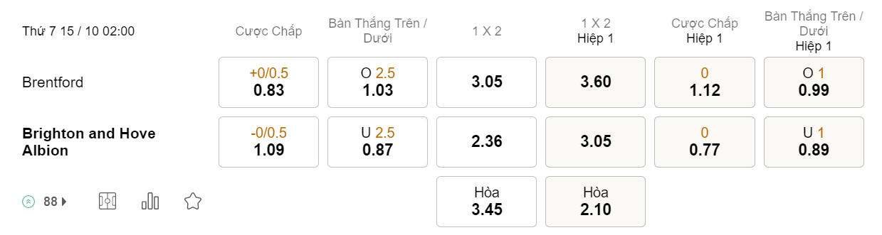 Tỉ lệ kèo Brentford vs Brighton