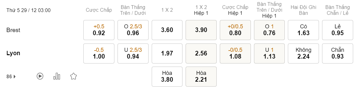 Tỉ lệ kèo Brest vs Lyon