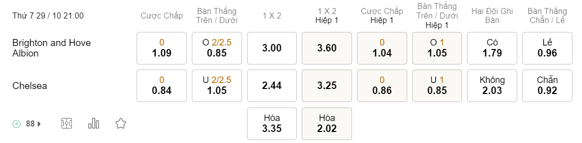 Soi kèo châu Á Brighton vs Chelsea: 1.09*0*0.84