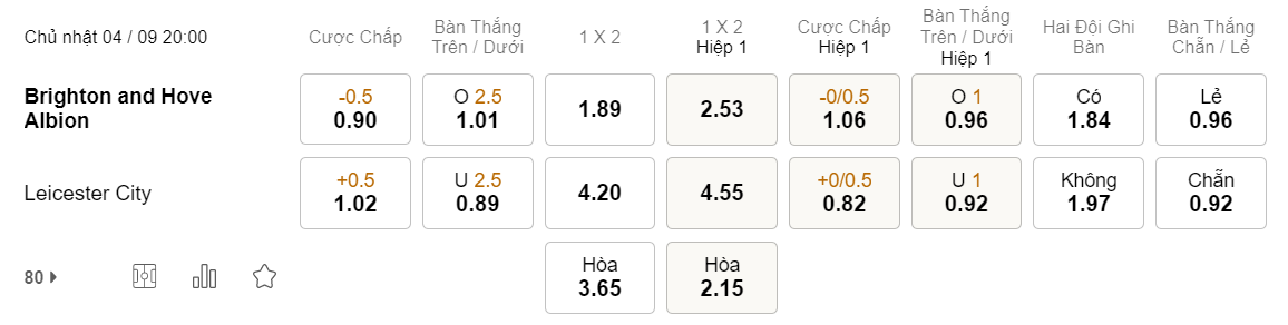 Soi kèo hiệp 1 Brighton vs Leicester: 1.06*0/0.5*0.82