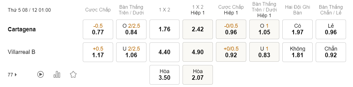 Soi kèo châu Á Cartagena vs Villarreal B: 0.77*0.5*1.17