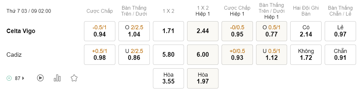 Tỉ lệ kèo Celta Vigo vs Cadiz