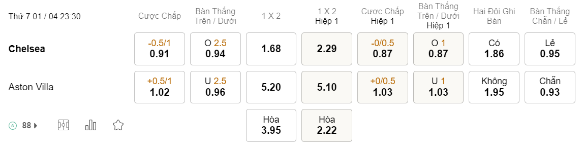 Tỉ lệ kèo Chelsea vs Aston Villa
