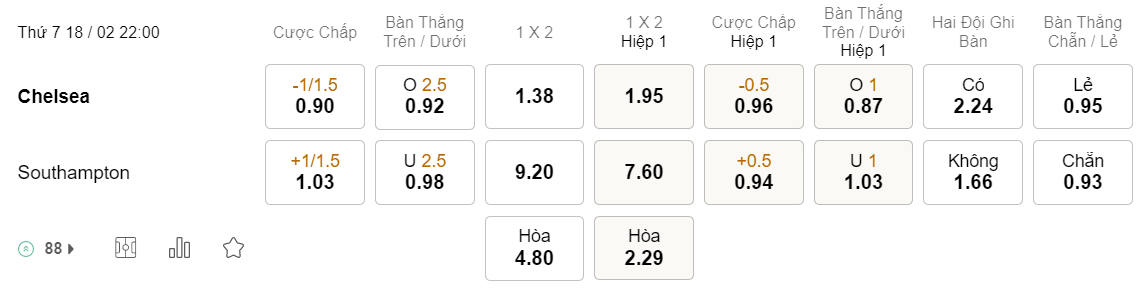 Tỉ lệ kèo Chelsea vs Southampton