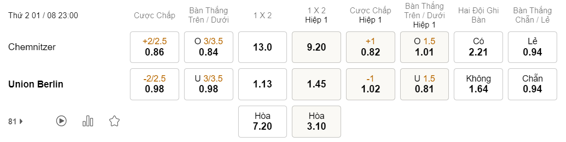 Tỉ lệ kèo Chemnitzer vs Union Berlin