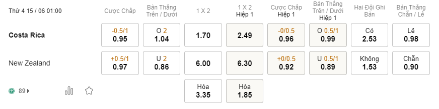 Tỉ lệ kèo Costa Rica vs New Zealand