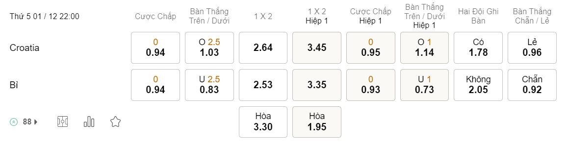 Soi kèo hiệp 1 Croatia vs Bỉ: 0.95*0*0.93