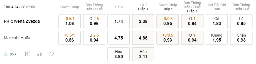 Tỉ lệ kèo Crvena Zvezda vs Maccabi Haifa
