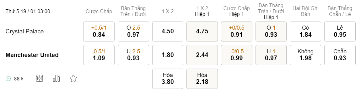 Soi kèo hiệp 1 Crystal Palace vs MU: 0.94*0/0.5*0.96