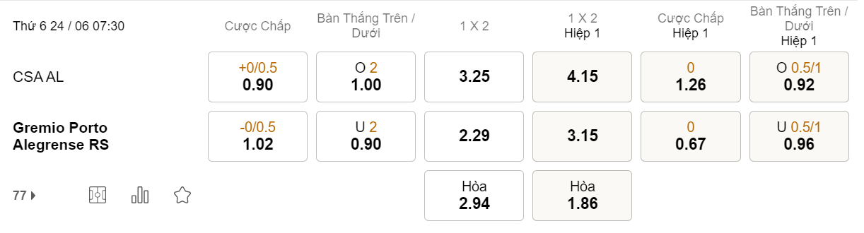 Soi kèo châu Á CSA vs Gremio: 0.90*0/0.5*1.02