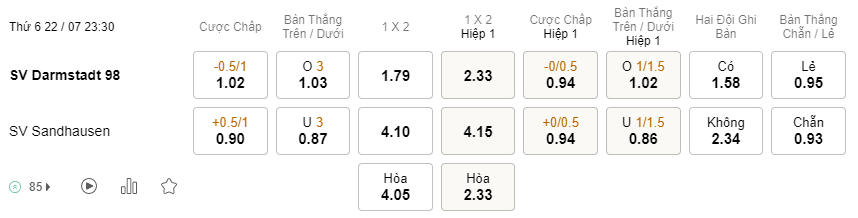 Soi kèo châu Á Darmstadt vs Sandhausen: 1.02*0.5/1*0.90