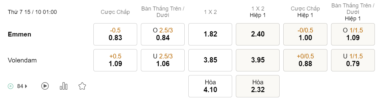 Soi kèo hiệp 1 Emmen vs Volendam: 1.00*0/0.5*0.88