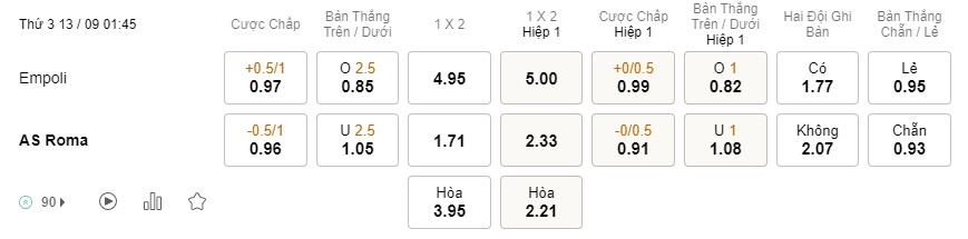 Soi kèo hiệp 1 Empoli vs Roma: 0.99*0/0.5*0.91