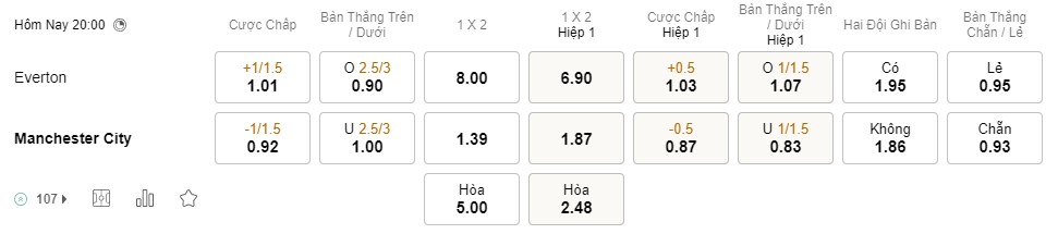 Soi kèo hiệp 1 Everton vs Man City: 1.03*0.5*0.87