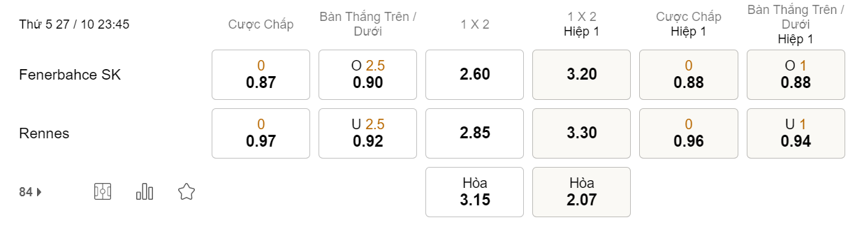 Soi kèo hiệp 1 Fenerbahce vs Rennes: 0.88*0*0.96