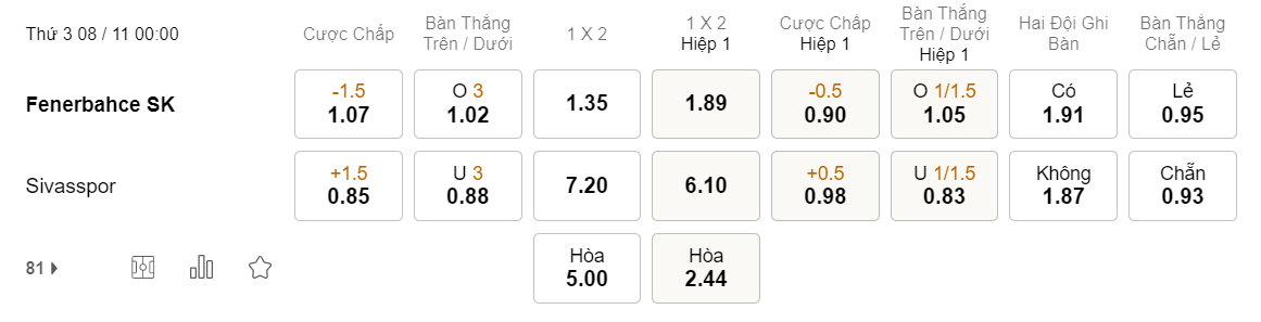 Soi kèo châu Á Fenerbahce vs Sivasspor: 1.07*1.5*0.85