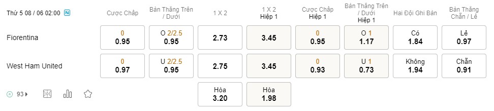 Soi kèo hiệp 1 Fiorentina vs West Ham: 0.95*0*0.93