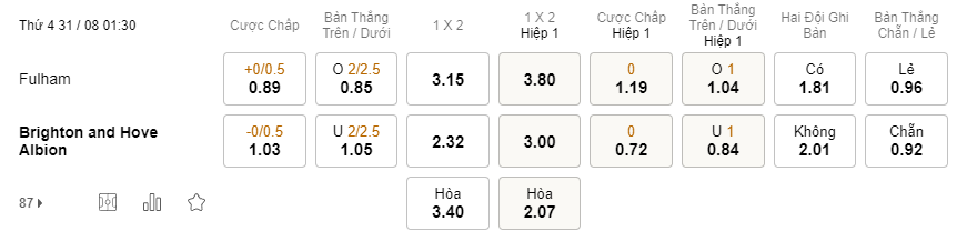Soi kèo hiệp 1 Fulham vs Brighton: 1.19*0*0.72