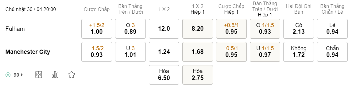 Soi kèo hiệp 1 Fulham vs Man City: 0.95*0.5/1*0.95