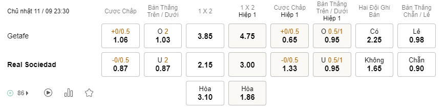 Tỉ lệ kèo Getafe vs Sociedad